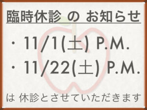 2025年11月1日 / 最終更新日時 : 2025年10月31日 kamiya 新着情報 臨時休診のお知らせ 神谷デンタルクリニック 臨時休診のお知らせです 当院は 11/1 (土) P.M. 11/22 (土) P.M. の診療を 休診とさせていただきます ご迷惑をお掛けしますが よろしくお願いします Instagram→https://www.instagram.com/kamiya_dental.clinic/